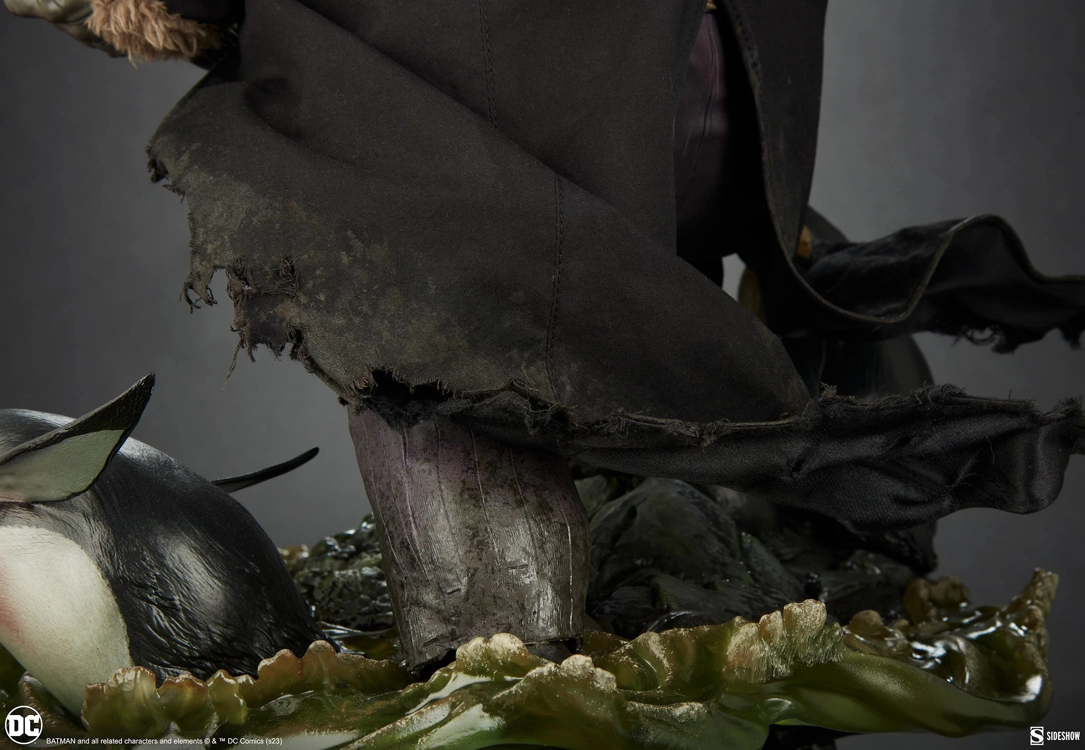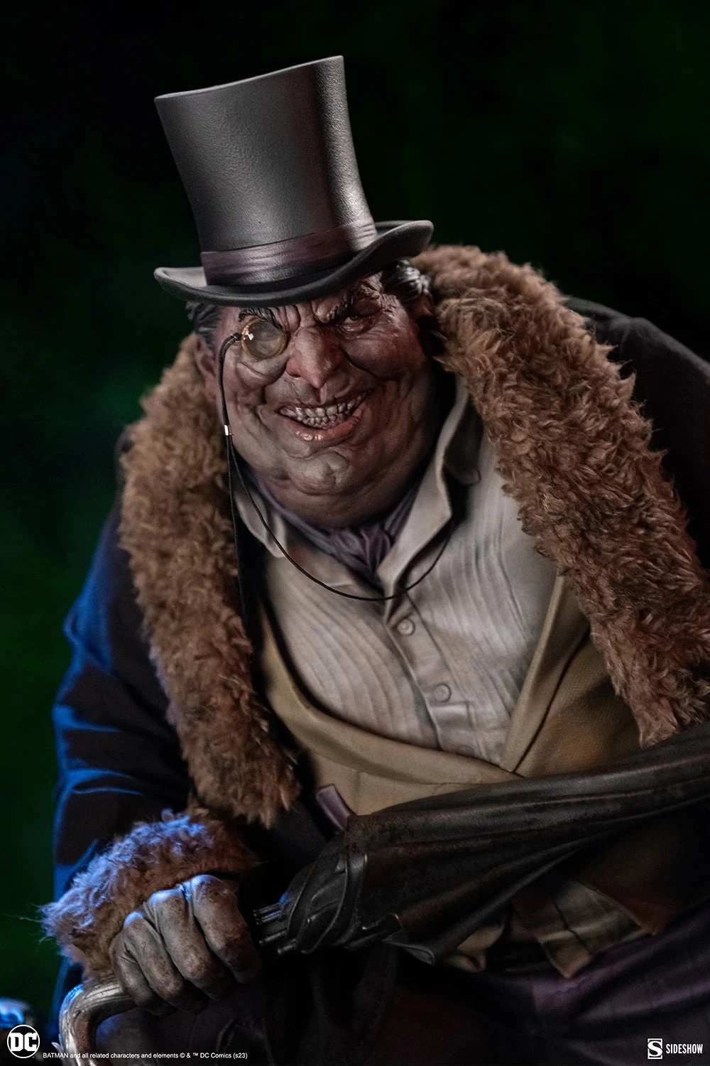 The Penguin Premium Format Figure combines polystone and resin sculptural elements with custom-tailored fabric costuming to create a detailed three-dimensional tribute to an iconic foe of the Dark Knight. His grotesque portrait has been crafted with all of his most identifiable features, including his beak-like nose, a clear monocle, and a black top hat. He wears a meticulously designed fabric overcoat lined with faux-fur trim and weathering details along the hem, giving Oswald an opulent but ominous appearance. The Penguin’s costume is complete with sculpted details such as his dress shirt, yellow vest, and purple pinstriped pants.