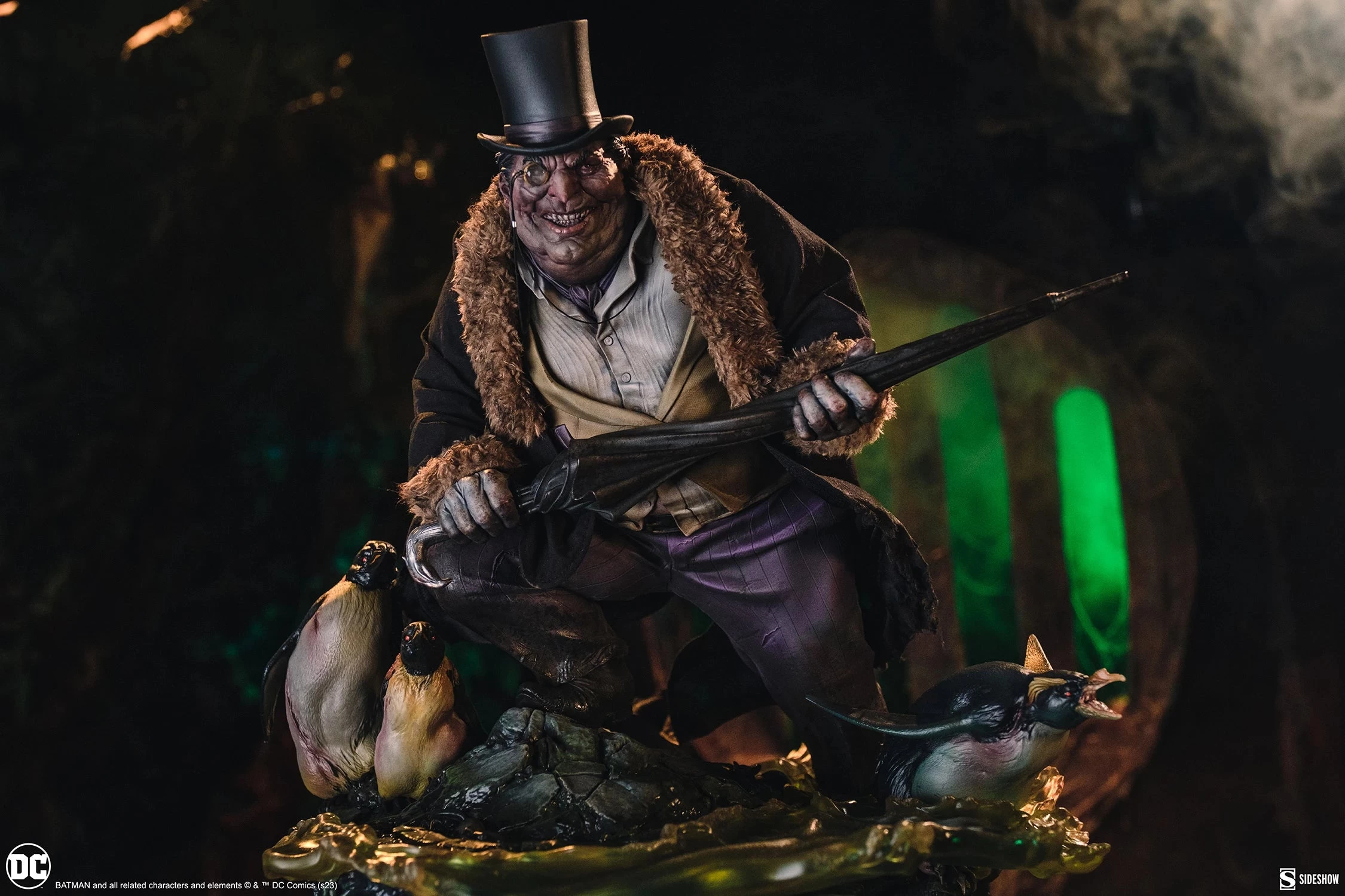For the first time ever, Sideshow’s artists have brought Gotham’s Gentleman of Crime to life as a stunning mixed media collectible for Batman fans. The Penguin Premium Format Figure measures 20” tall and 16” wide as Oswald Cobblepot crouches in the sewers below the city, surrounded by a small colony of his namesake birds. This high-society lowlife is no one to laugh at as he clutches his signature umbrella and squawks over his latest scheme. The statue base features clear cast water elements and theatrical coloration to reflect the murky environment as the vicious penguins swim through the scene.