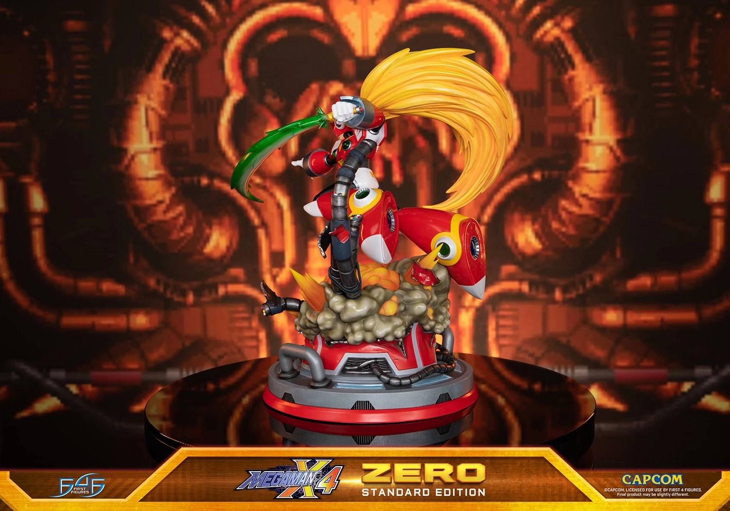 This statue features Zero in a dynamic action pose, leaping out of an explosion, brandishing his trademark weapon: the Z Saber.