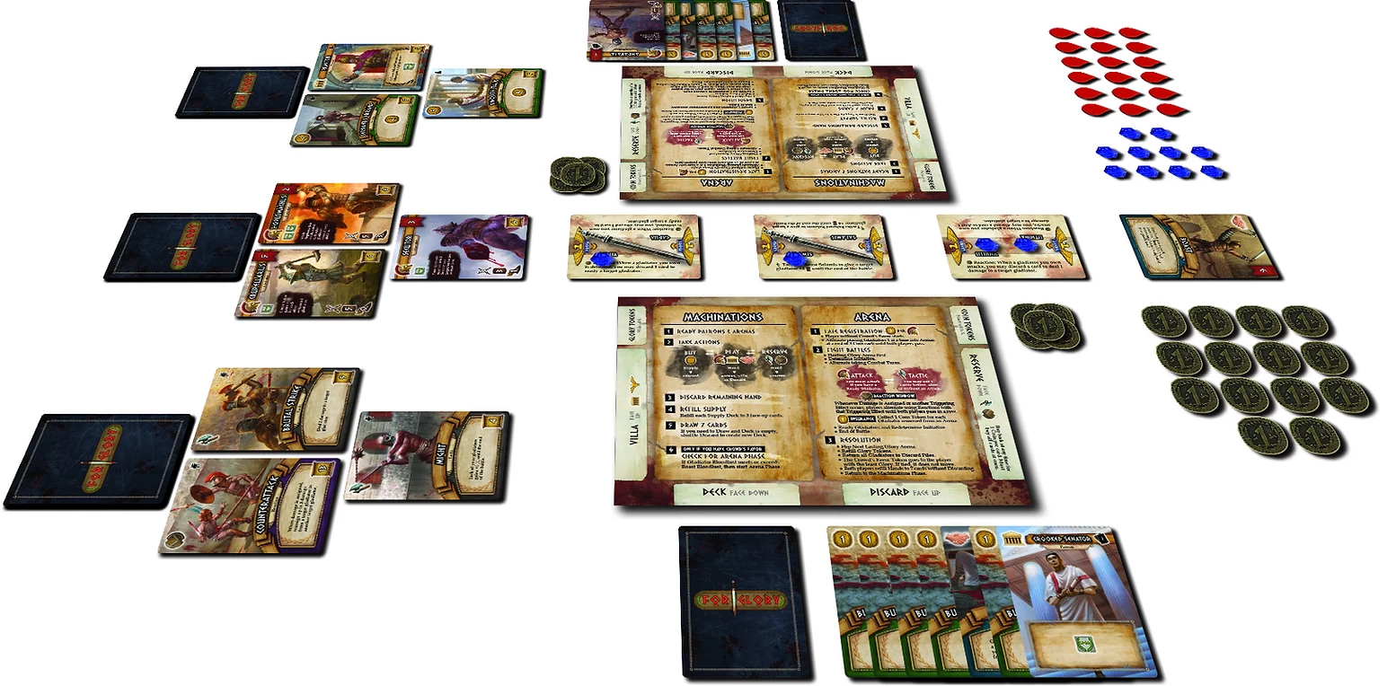 For Glory is a game of gladiatorial combat and deck building for 2 players. Players take on the role of gladiator school owners, or lanistas, in ancient Rome. The game utilizes a two-phase system for deck building and combat. During the Machinations Phase, players recruit gladiators, secure the support of influential patrons, increase their income, and train their gladiators in a multitude of tactics. When the crowd’s bloodlust becomes insatiable, the game shifts to the Arena Phase, during which players control their gladiators in various arenas to battle their opponents’ gladiators for glory. Each gladiator has a unique set of stats and a unique ability. Having the right synergies between gladiators often means the difference between death and glory. During arena battles, players also play tactic and reaction cards from their hand to support their gladiators, or turn the tides of battle. The first player to gain six glory by winning arena battles is the victor, and will be remembered for all time as the greatest lanista of Rome.