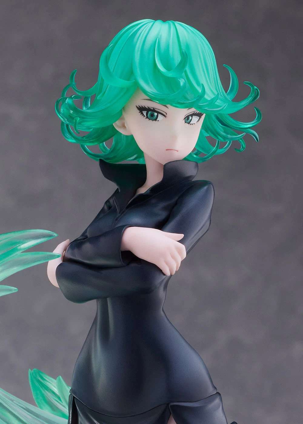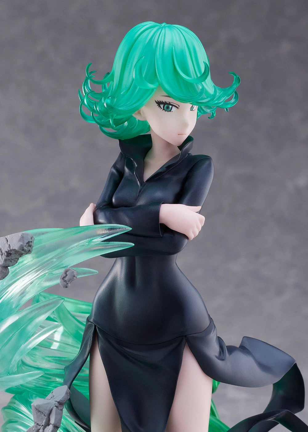 From the TV anime “One-Punch Man” comes a scale figure of the S-class hero “TERRIBLE TORNADO”! Dressed in a black dress coat, her beautiful legs peeking through the slit, her dazzling expression with her eyes crossed, and her arms crossed all express TERRIBLE TORNADO’s personality to the fullest. The characteristic curly hair and the green effect pedestal use clear parts to create a world view inspired by supernatural powers. Please welcome TERRIBLE TORNADO with a cool expression.