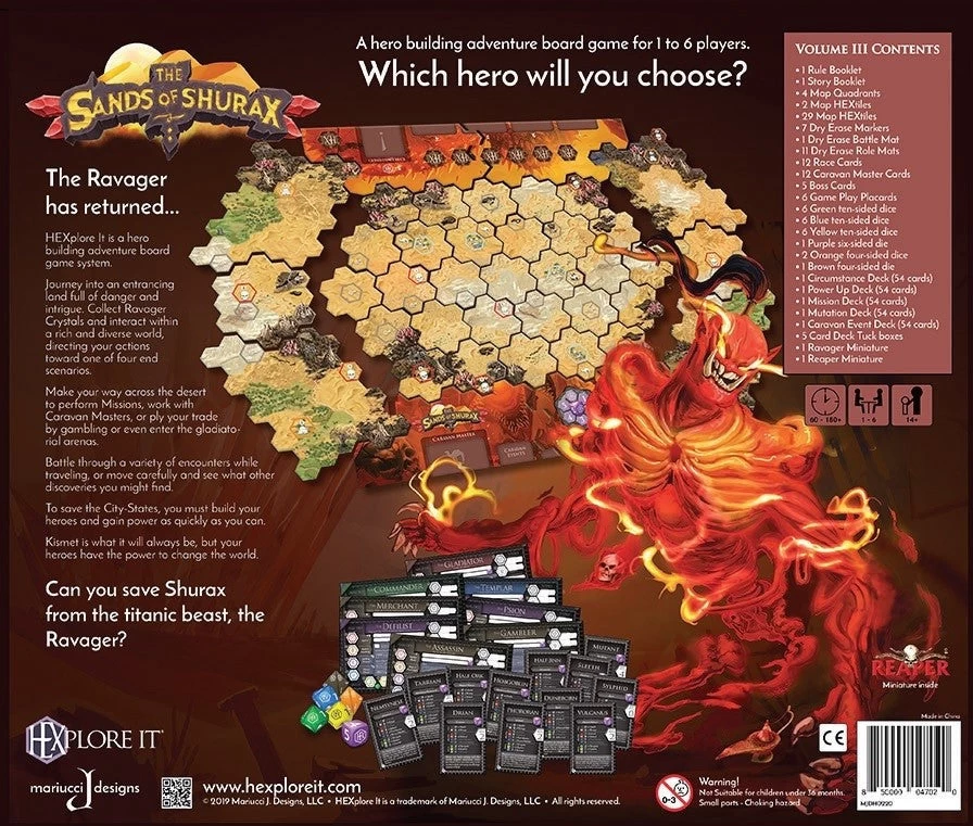 HEXplore It is a hero-building adventure board game system. The Sands of Shurax is our third title in the series. It is both a stand-alone game and an expansion to the first and second volumes.