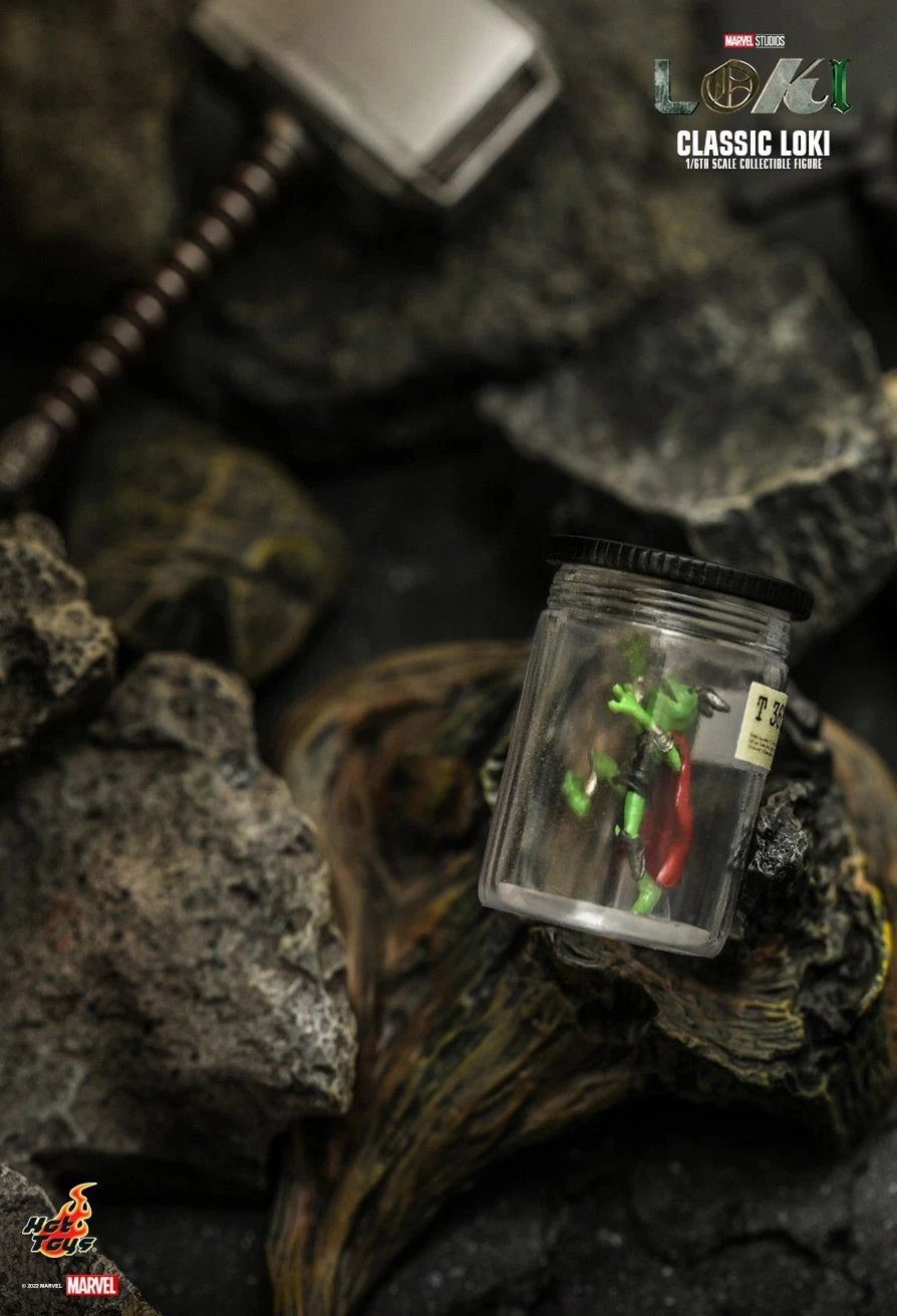 Expertly crafted based on the appearance of Richard E. Grant as Classic Loki from Loki, the figure features a newly developed head sculpt with horned helmet, interchangeable face sculpts highlighting grinning and serious expressions, iconic comic inspired costume with screen accuracy and weathering effects applied, an array of highly-detailed accessories including Frog Thor in bottle, battle damaged helmet, travel bag, Alligator Loki in one-sixth scale, green magic effect accessories, a character backdrop and a themed figure stand.