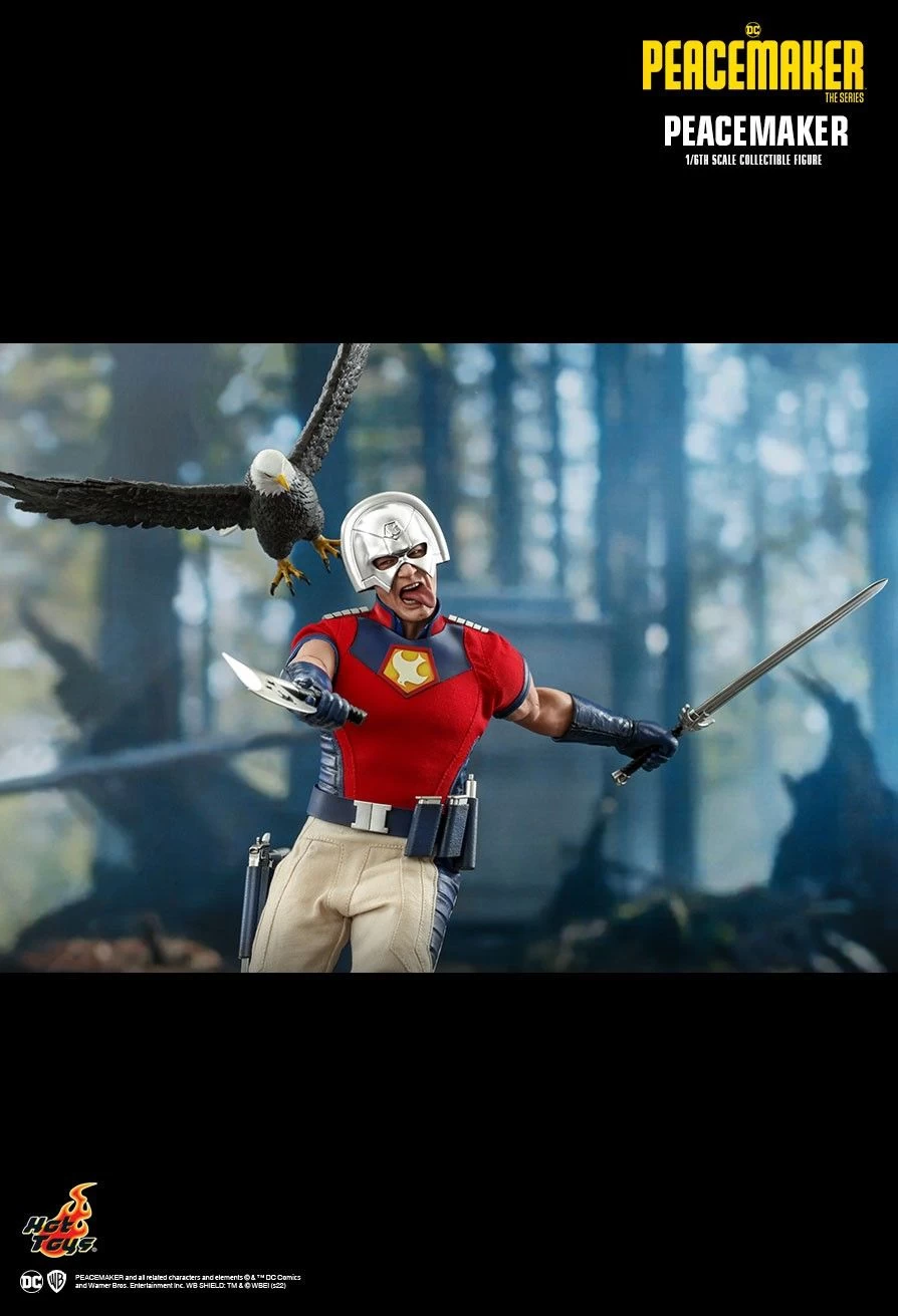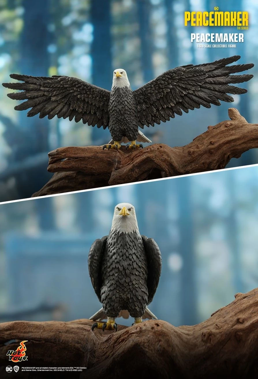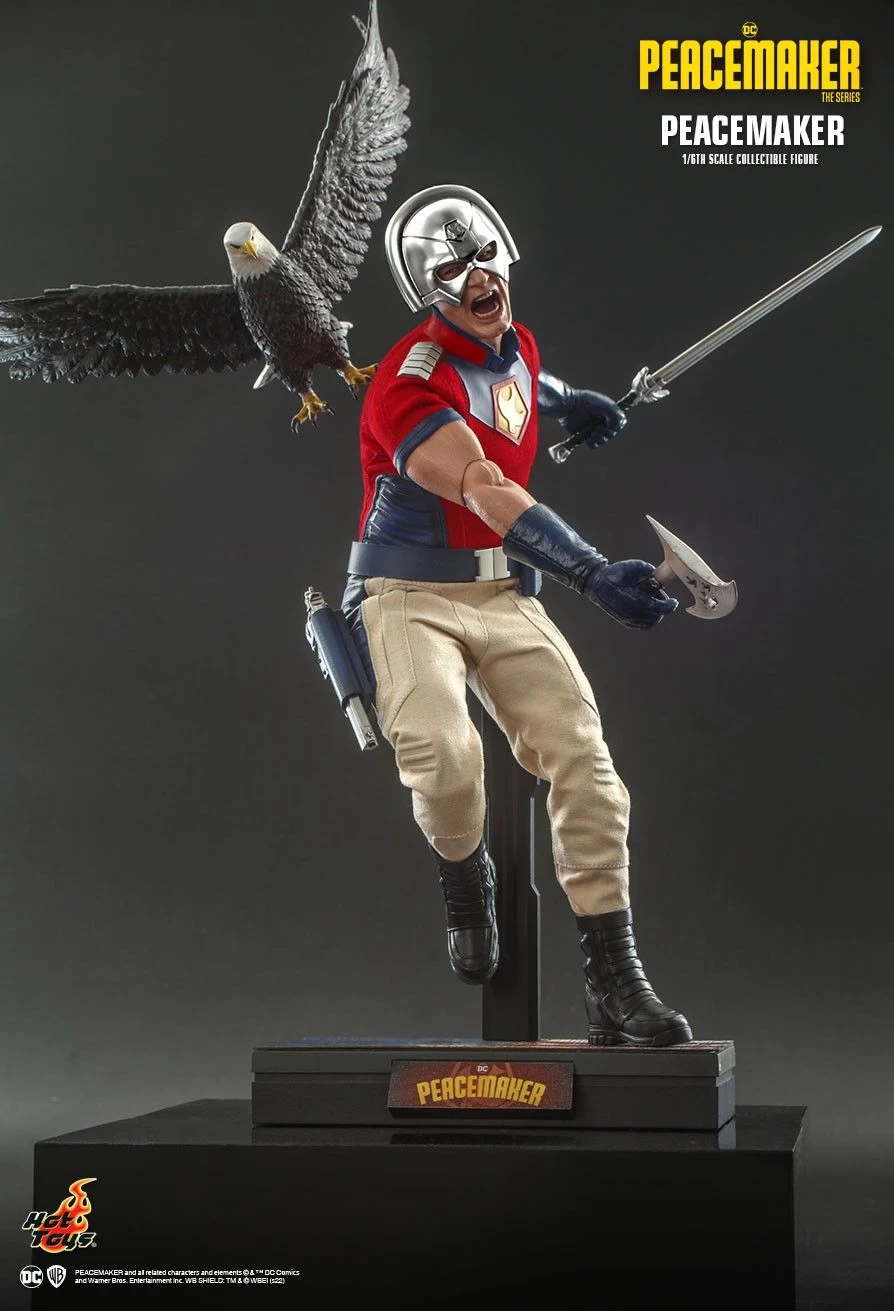 Sophisticatedly crafted with striking likeness of Peacemaker’s appearance portrayed by John Cena in the action series, the 1/6th scale figure features a newly developed helmet head and an interchangeable helmet covered in silver chrome finish with details, an attachable tongue to create alternate expressions, a specially tailored outfit, weapons including a sword, an axe, and a figure stand. The sidekick of the show – Eagly will also come as a 1/6th scale accessory with spread wings for complete collector experience.