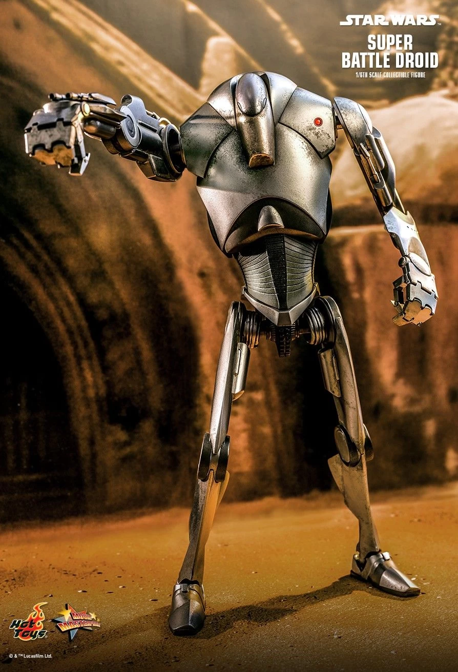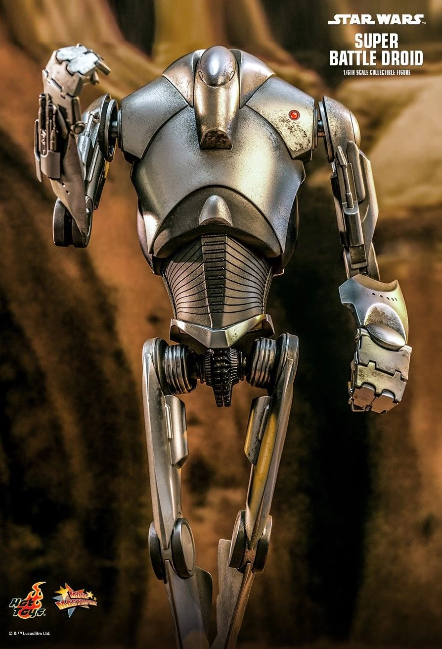 The 1/6th scale Super Battle Droid collectible figure is based on its appearance in the Geonosisâ„¢ arena battle. It features a newly developed mechanical structure with stunning metallic paint applications, a wide range of articulations, and a sand-themed display stand!