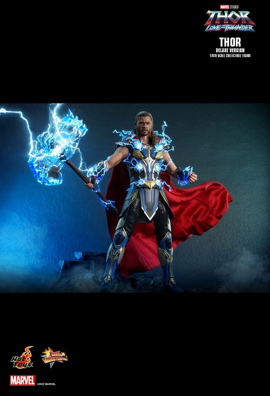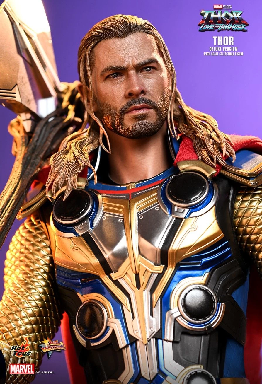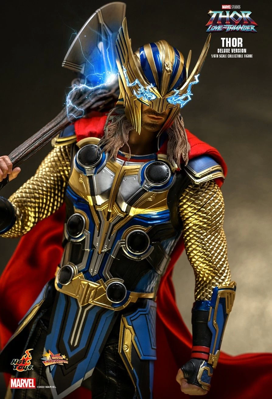 In anticipation to the release of Thor: Love and Thunder, Hot Toys is thrilled to introduce a Deluxe Version of the new 1/6th scale collectible figure of the God of Thunder – Thor with his new metallic gold and blue costume!