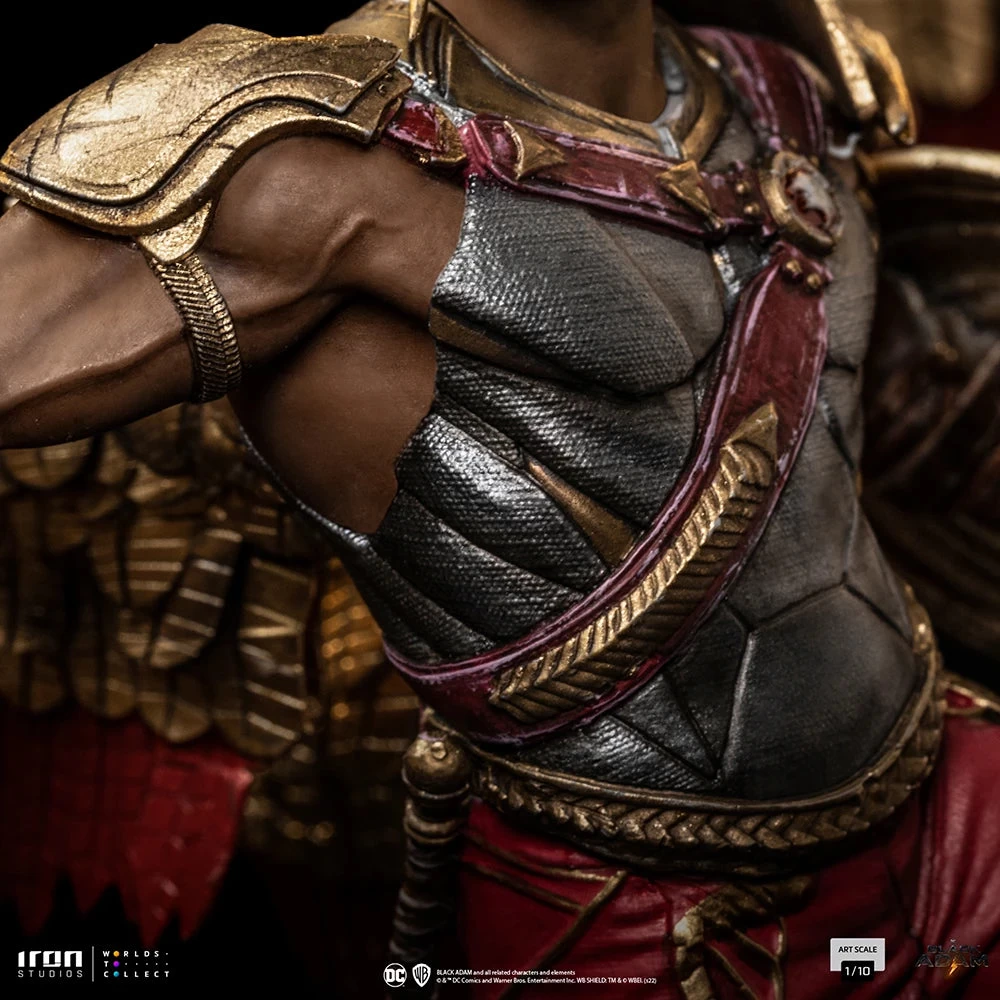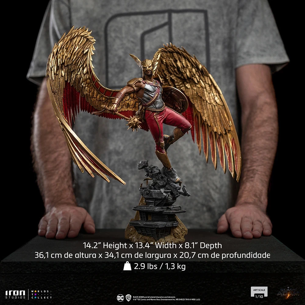 With his big gold and red wings opened from his suit, formed by multiple bars that simulate his feathers, protect him, and allow him to fly at high speed, the winged champion of justice takes flight propelled by his armor built with using the Nth metal, a rare and exotic mineral that allows his suit to defy gravity. Wielding a spiked mace endowed with the nth force for in missions, capable of weakening his foes without actually killing them, and bringing a golden shield in his left arm with his symbol in the shape of a bird of prey’s head in the center, as a complement to his suit, he owns a winged helmet with golden textures all around that besides protecting him, also maintains his identity. Over a diorama pedestal where ancient Egyptian ruins connect to metallic platforms, Iron Studios present their statue “Hawkman BDS – Black Adam -Art Scale 1/10”, with the noble and experienced leader of the Justice Society in the DCEU (DC Extended Universe).