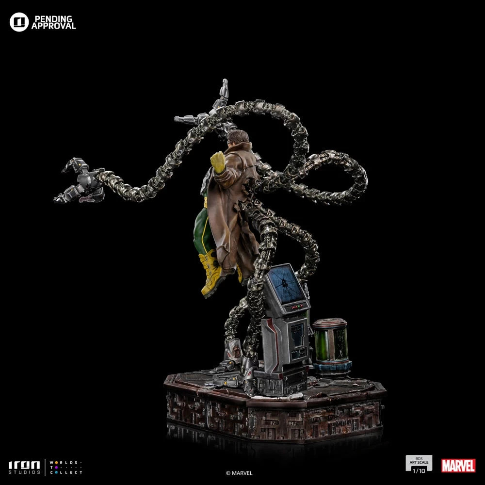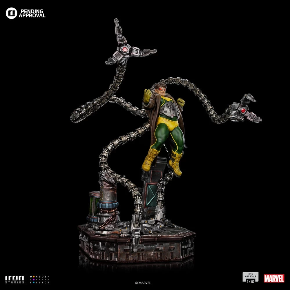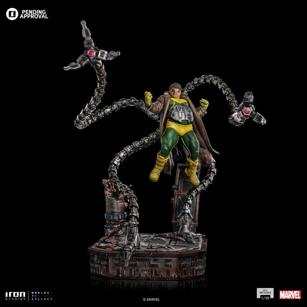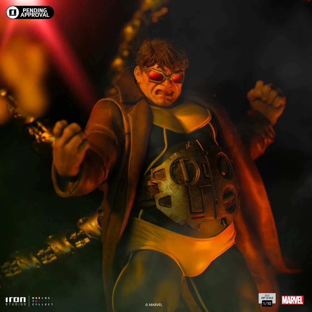 Even though they move like independent and individual living beings, in reality, each one of the four metallic Titanium-Steel tentacles meticulously follow each command from the complex mind of their master, connected by a steel harness that encloses the robust body of a proud scientist, a genius in the research of nuclear radiation, corrupted by an accident that led him into a life of crimes. Each tentacle terminates in three powerful single-jointed pincers, two of them raise the supervillain, nailing the floor just like animal paws in a base formed by rustic techno-industrial elements, including the logo of the infamous Oscorp, while the others are ready to attack. Iron Studios proudly bring the Doctor Octopus – Spider-man Vs Villains Diorama – BDS Art Scale 1:10 Scale Statue, presenting a new and never-before-seen version of one of the greatest archenemies of Spider-Man and one of the most iconic villains in Marvel’s universe, wearing a variant of his classic green costume with gloves, boots, and details in orange yellow, covered by a brown overcoat. This statue is the second release in the Spider-Man Vs Villains line, the collection that will form an incredible diorama set, composed by statues of the most popular villains and characters in the universe of Spider-Man in Marvel’s comic books.