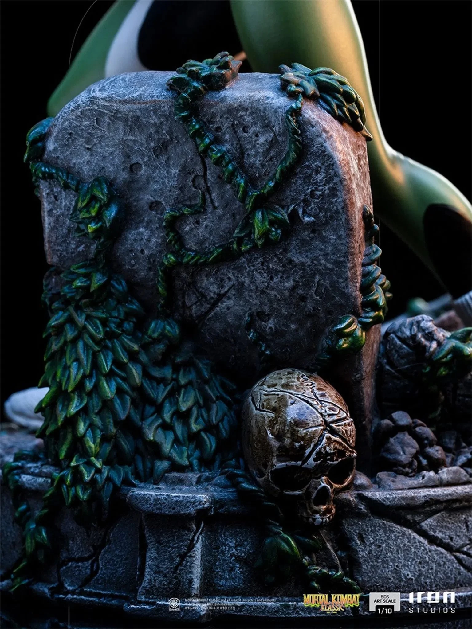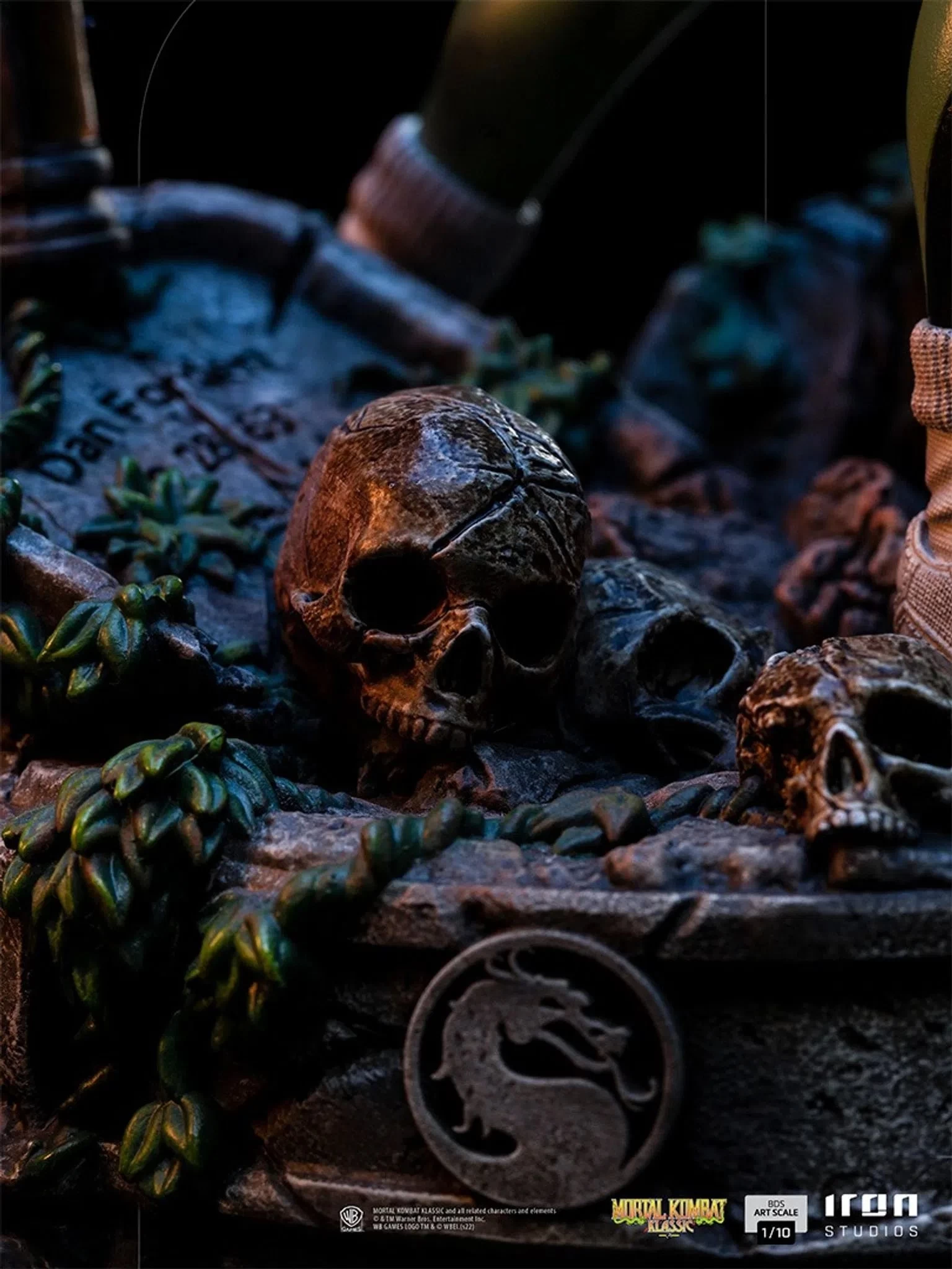 Mortal Kombat is a tournament of martial arts that happens between different realms or dimensions from generation to generation and needs to be won 10 times in a row to guarantee the winner the chance to control the realm where the competition takes place. In the past, she was a soldier member of the OIA (Outer World Investigation Agency) Special Force unit on the series of fighting games Mortal Kombat, until she became commander of every Special Forces and Units operation. Debuting in the first Mortal Kombat arcade game, Sonya Blade is a tough and obstinate fighter, with many skills thanks to her training in the Special Forces. Iron Studios pay tribute to two of Mortal Kombat’s creators, the sound designer Dan Forden, better known for his photo and voice shouting “Toasty!” in falsetto on the right corner of the screen in some parts of the game (an inside joke between the members of the developing team), and the series’ head writer John Vogel, writing their names on the tombs in the pedestal with skulls, moss, and an old lamp.