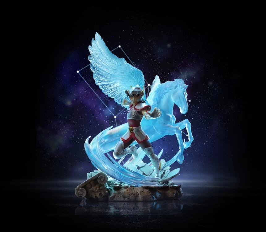 Pegasus Saiya from the Saint Seiya anime series is presented in the 1/10 Art Scale line from Iron Studios! This detailed deluxe version features the translucent Pegasus behind our hero!