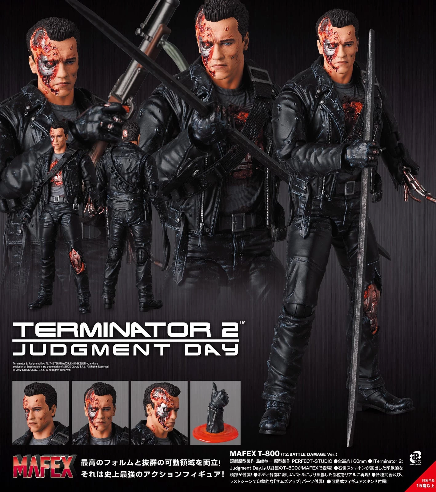 His head features impressive battle damage with the metallic parts underneath showing through; he comes with various weapons, as well as the “thumbs up” from the final scene! A stand with a posable support arm is also included. Order this iconic character for your own collection!