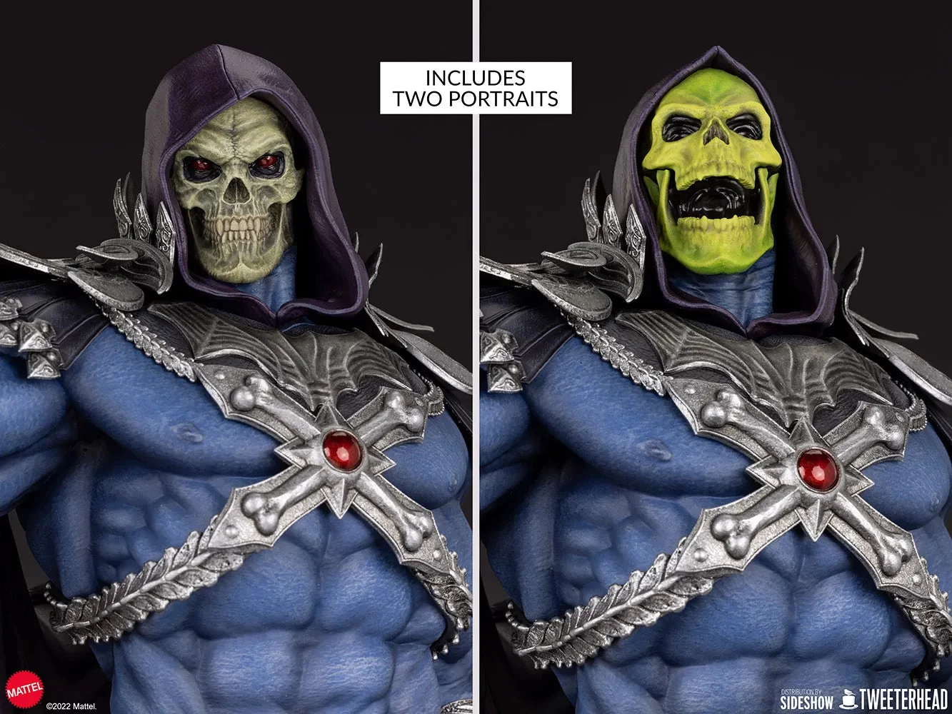 The polyresin Skeletor Maquette includes a number of swap-out features allowing fans to craft their perfect display of power. Choose between the classic portrait with a cackling expression or a modern portrait with a grimacing expression. Skeletor also features swap-out left hands — one in a clawed gesture and one holding the Power Sword. When holding the Power Sword, the figure measures 16.5″ wide.