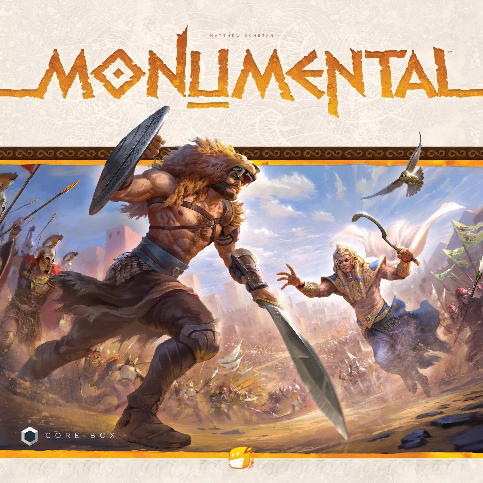 A modular board, at the center of the table, holds each civilization’s army. The board is made of Provinces to be conquered. Unoccupied Province’s inhabitants are barbarians who will provide resources to the player who defeats them. Holding a conquered province also brings victory points.