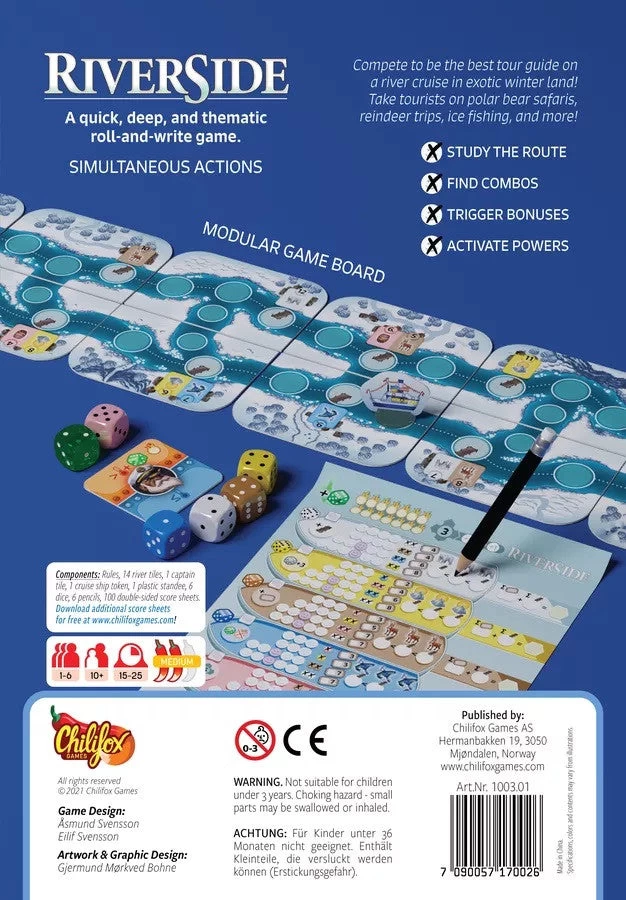 Riverside is a different kind of roll-and-write game: The game comes with a modular game board, which composes the route for the game. On a river cruise boat, everyone follows the same route, but you can take your tourists on different tours. You may plan ahead, but beware, the dice may force you to change your plans.