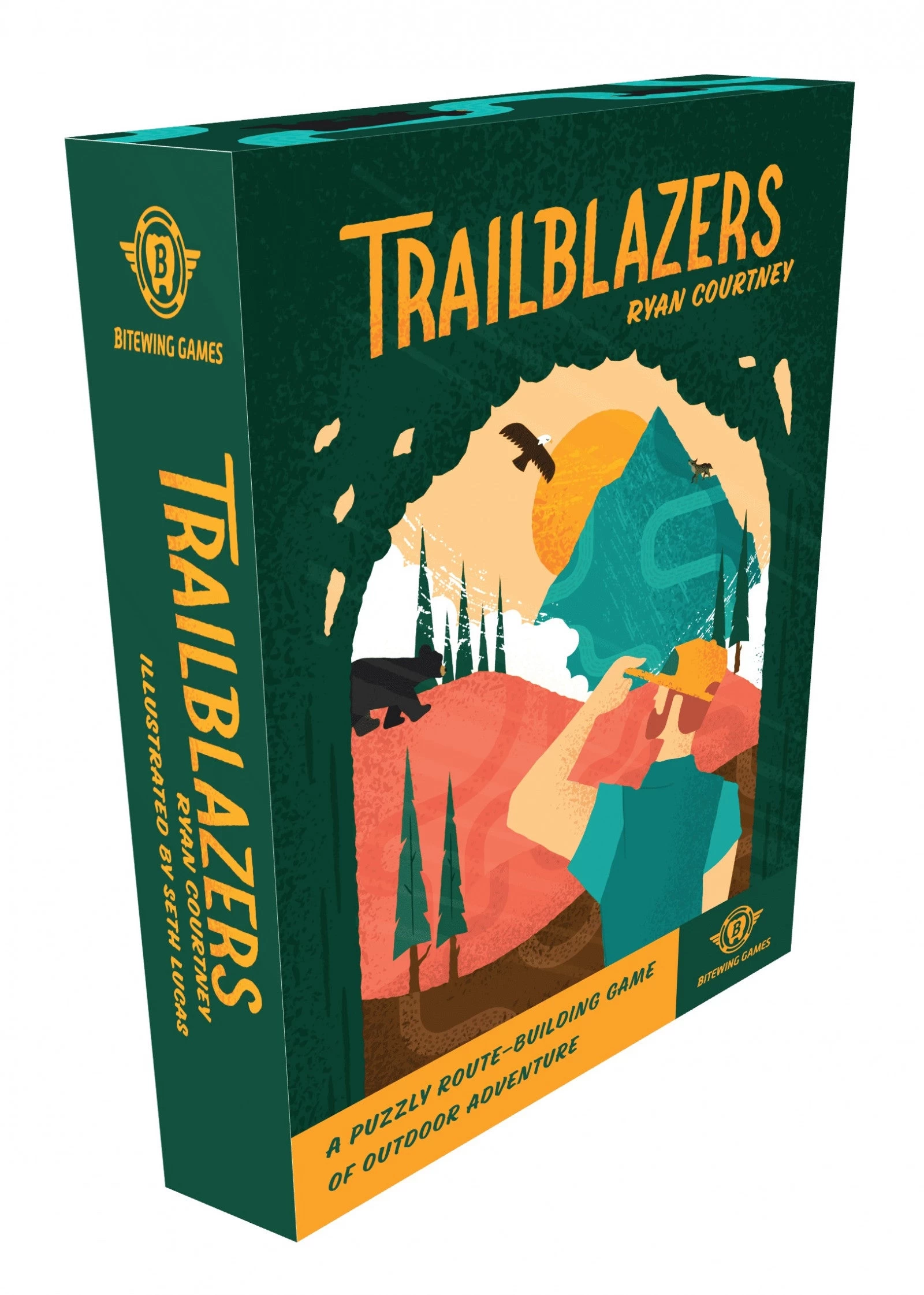 In Trailblazers, players compete to earn the most points by building biking, hiking, and kayaking loops from their campsites of the matching trail type. Each round, players are dealt eight trail cards where they’ll draft two cards, arrange those cards in their personal area, and pass their hand to the next player three times. Cards must either be placed adjacent to or overlapping other cards. While players can push their luck by aiming to construct long and elaborate trails, only closed loops that start and end at a matching campsite will score points. Players also compete to fulfill “First To” and “End Game” goal cards. After four rounds, the game ends and the player with the most points from closed loops and goal cards wins.